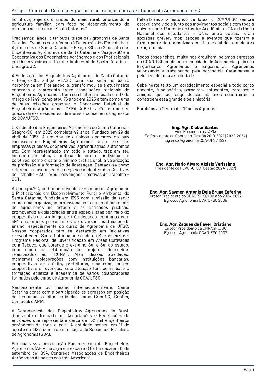 Artigo das Entidades da Agronomia - FEAGRO-SC, SEAGRO-SC e UNEAGRO/SC - publicado como capítulo 31 do E-book comemorativo aos 50 anos do CCA/UFSC